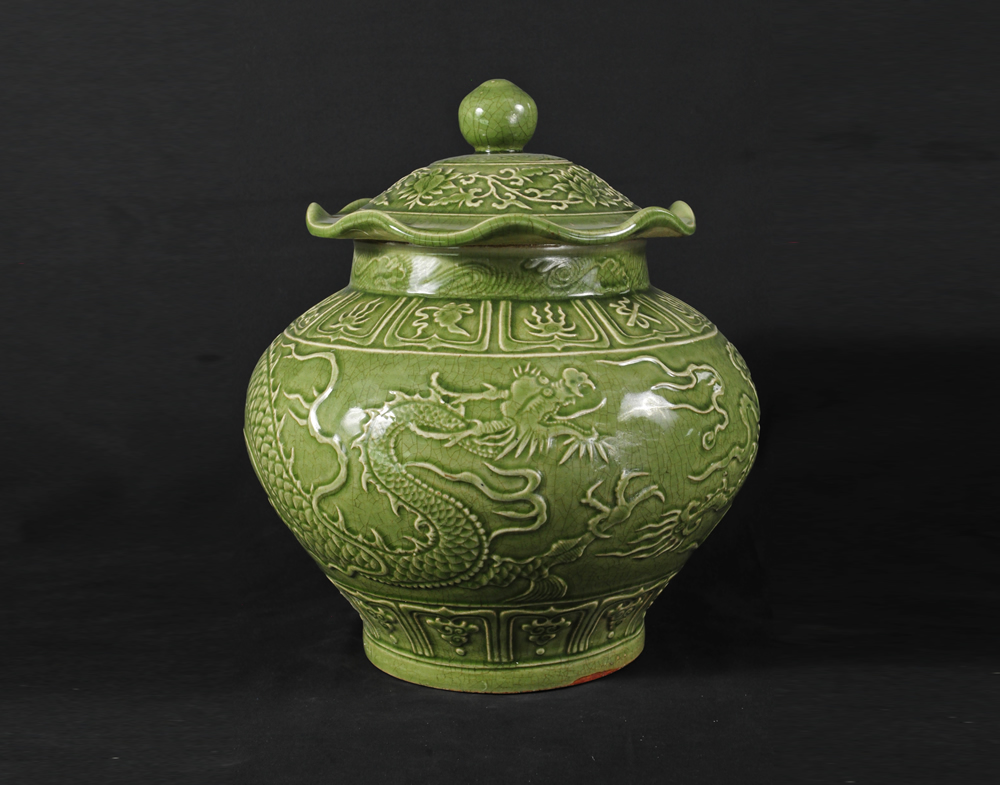 宋龙泉窑龙纹荷盖将军罐