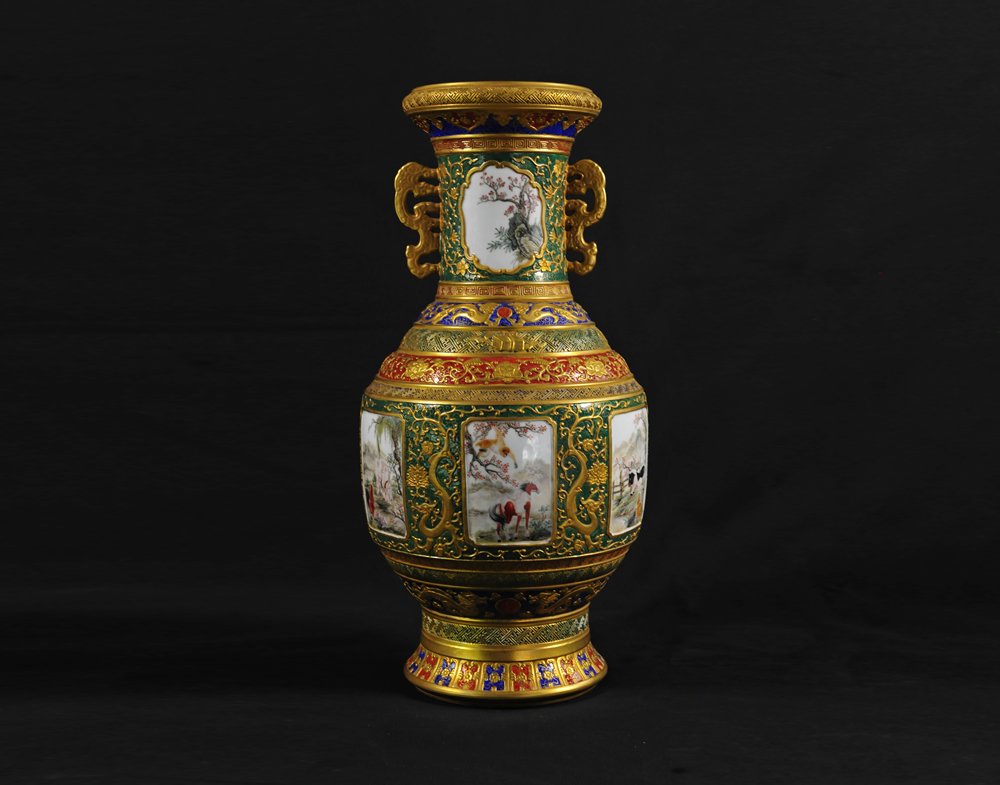 大清乾隆珐琅彩鎏金十二生肖双耳瓶