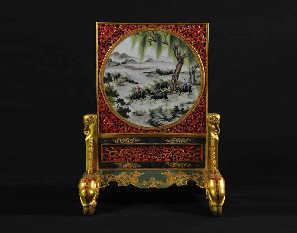 清乾隆鎏金珐琅彩牧童插屏