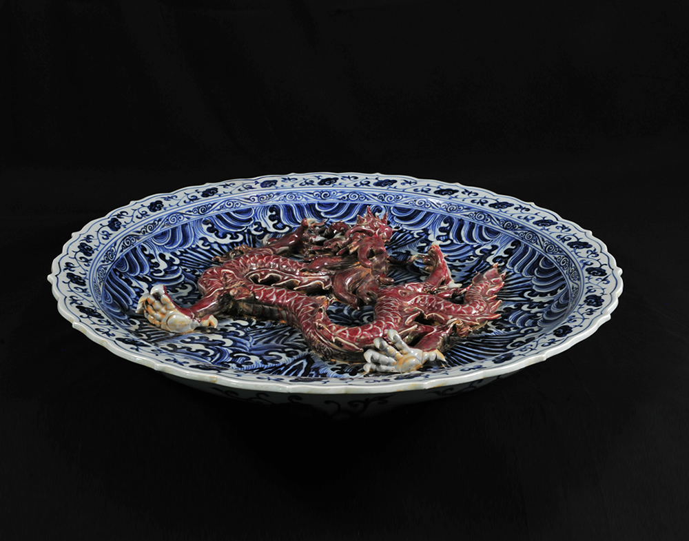 明宣德青花釉里红雕塑龙纹大盘