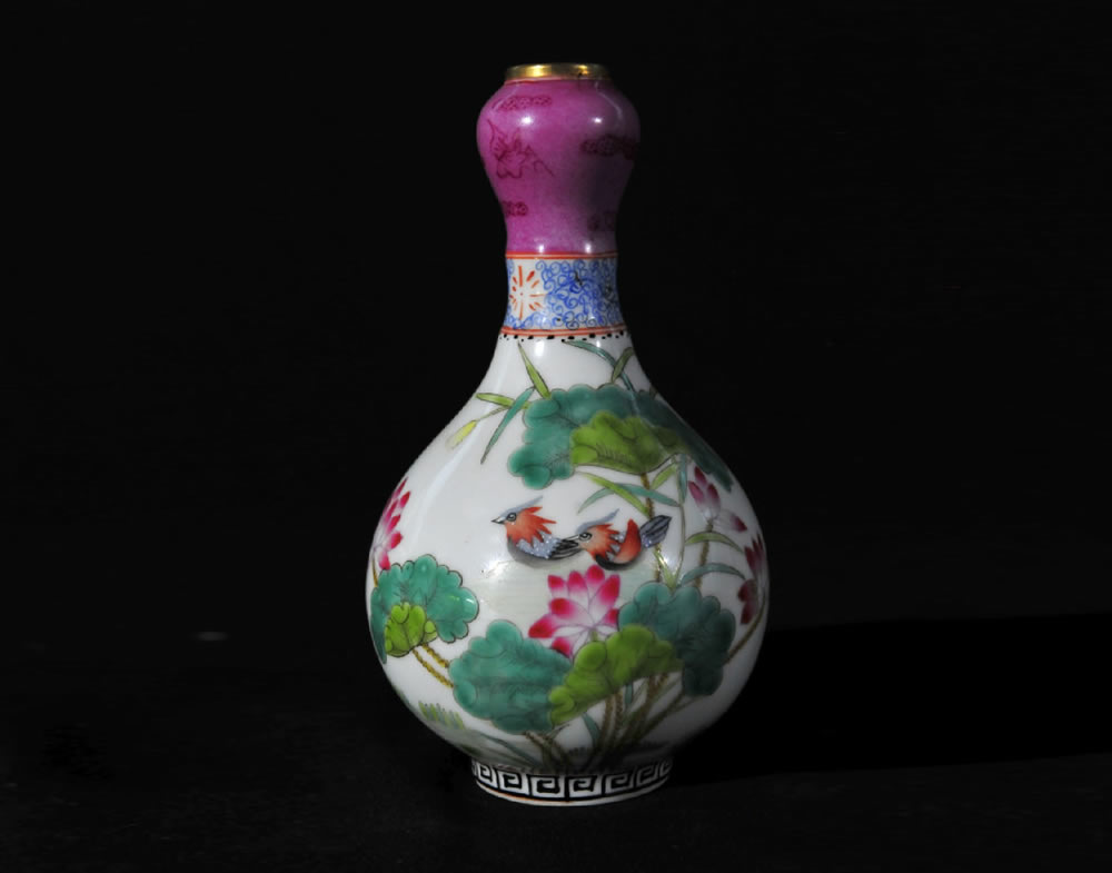 清·雍正·粉彩鎏金鸳鸯蒜头瓶
