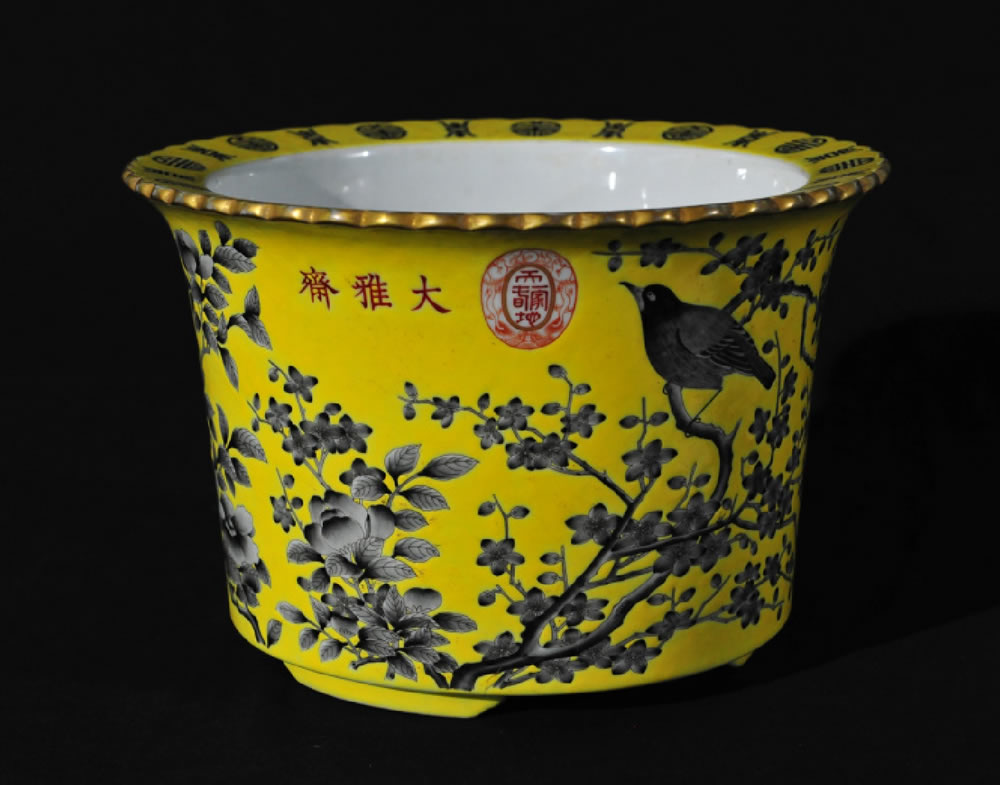 清·大雅斋·黄地花鸟花盆