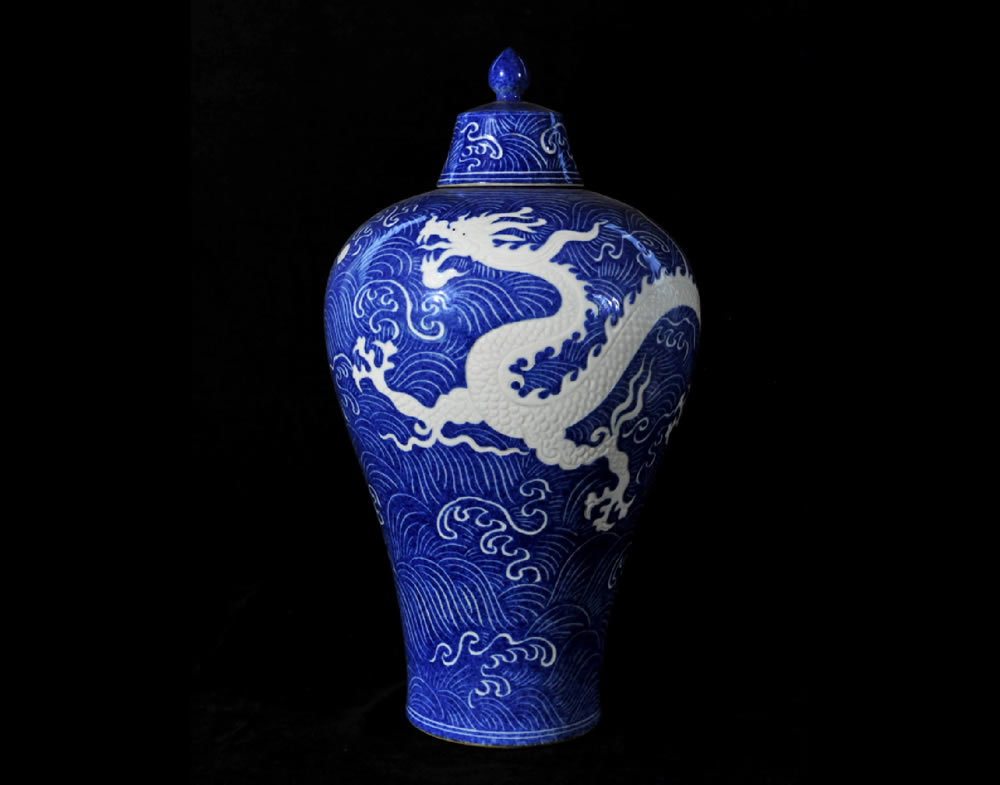 明·宣德·蓝釉雕刻海水龙纹梅瓶