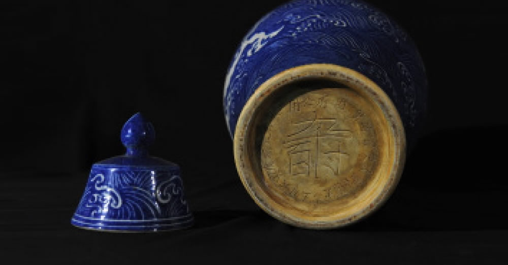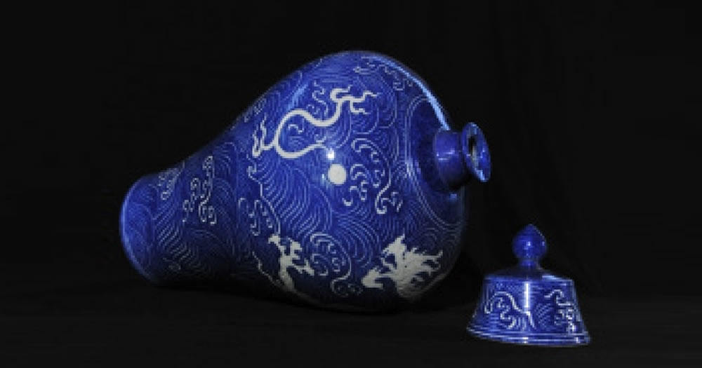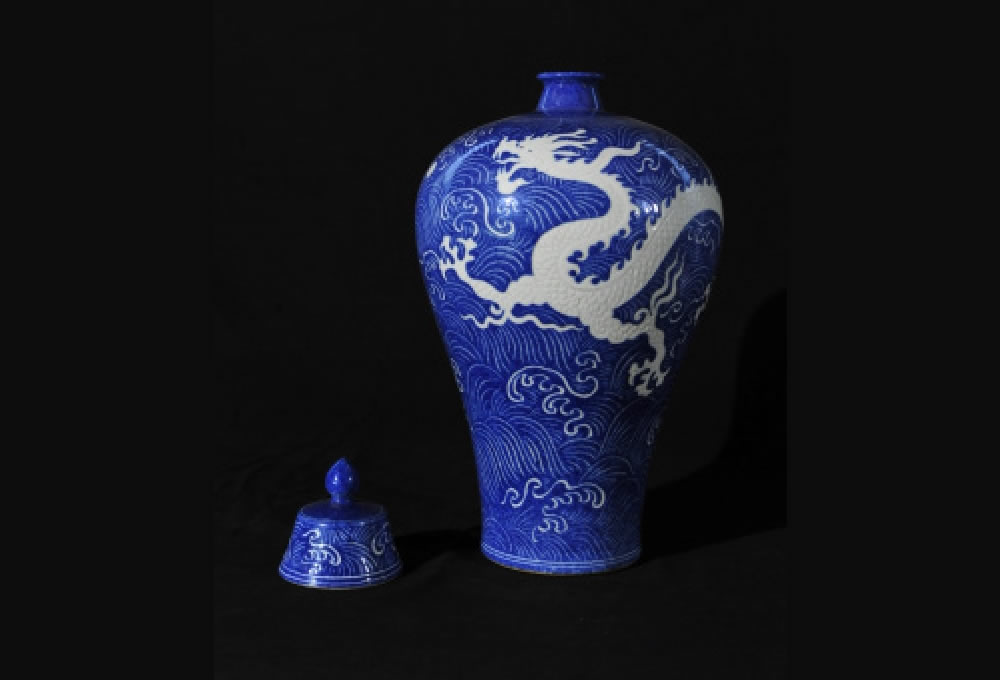 明·宣德·蓝釉雕刻海水龙纹梅瓶